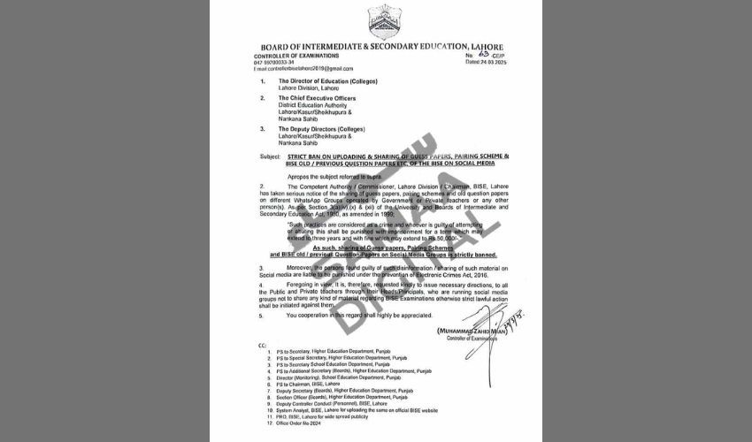 Lahore Board of Intermediate and Secondary Education (BISE) has imposed a ban on sharing past Matric and Intermediate exam papers on social media platforms.