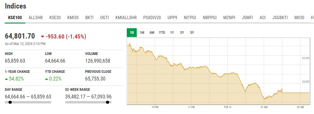 On the first day of Ramazan, the Pakistan Stock Exchange (PSX) witnessed a severe downtrend and could not maintain the limit of 65,000 points after falling over 1,000 points.
