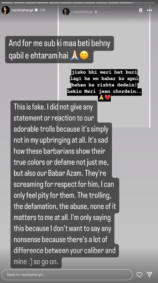 Actress Nazish Jahangir, who has been facing unwanted backlash from Babar Azam fans for refusing a hypothetical marriage proposal now broke her silence and clarified her position on the circulating content associated with her name.