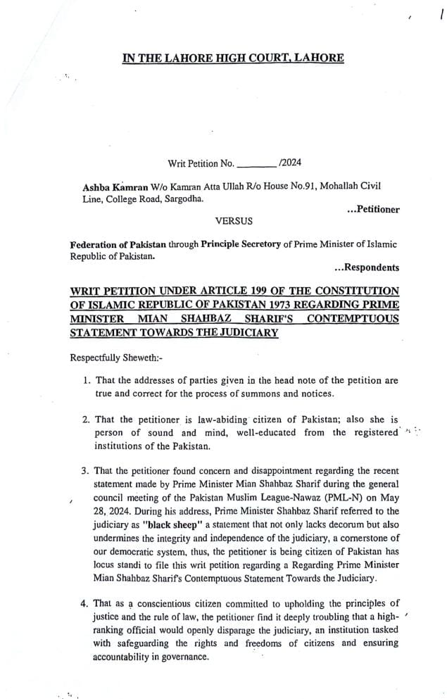 “During his address, Prime Minister Shehbaz Sharif referred to the judiciary as black sheep, a statement that not only lacks decorum but also undermines the integrity and independence of the judiciary, the cornerstone of our democratic system, this the petitioner is a citizen of Pakistan has locus standi to file this writ petition regarding a regarding PM Shehbaz Sharif’s contemptuous statement towards the judiciary.