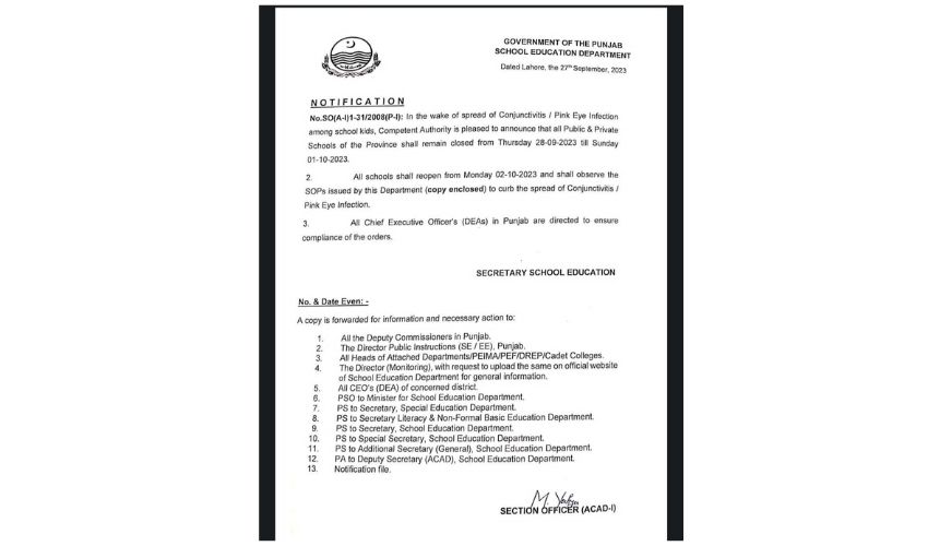In a bid to curb the spread of pink eye infection, all government and private schools in Punjab have been ordered to remain closed for four days.