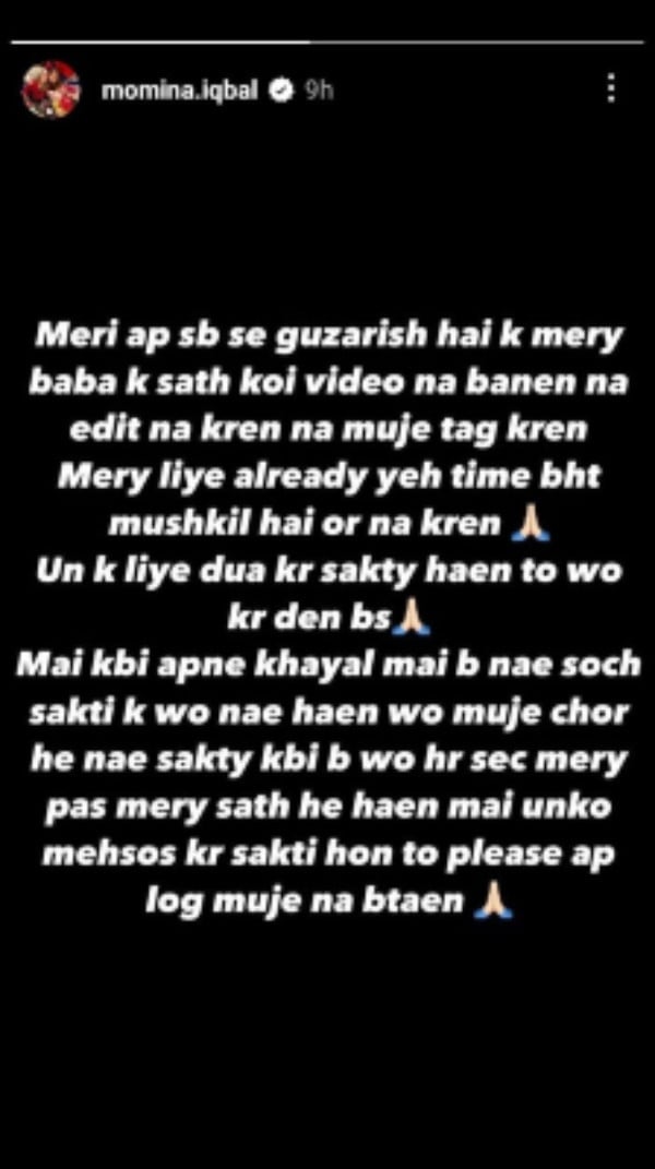 "Please do not edit and share any videos of my father on social media, nor tag me in such videos. This time is tough for me," Momina stated in her Instagram story.