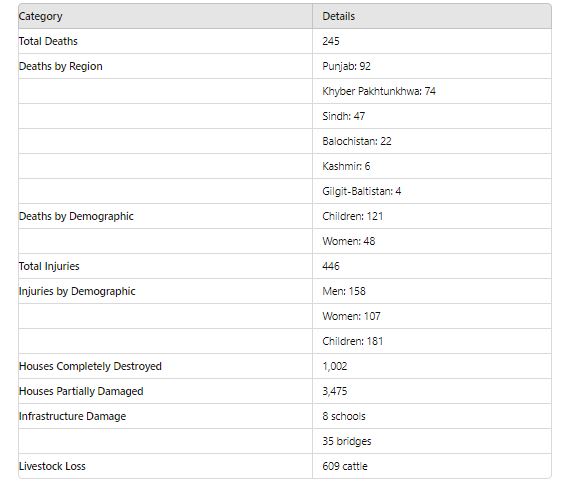 The recent monsoon rains and floods across the country have resulted in a tragic loss of 245 lives from July 1st to August 27th, according to the National Disaster Management Authority (NDMA).