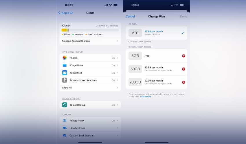Need more iCloud space? Storage upgrades start at just $1 monthly for 50GB, with options for 200GB ($3/month) or 2TB ($10/month). Access these plans through Settings > [your name] > iCloud > Manage Account Storage > Buy More Storage. Each paid plan includes iCloud+ features like Private Relay and Hide My Email.