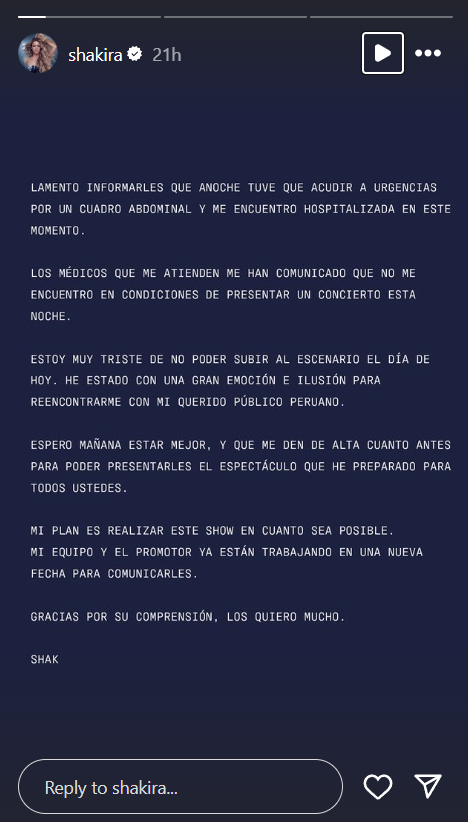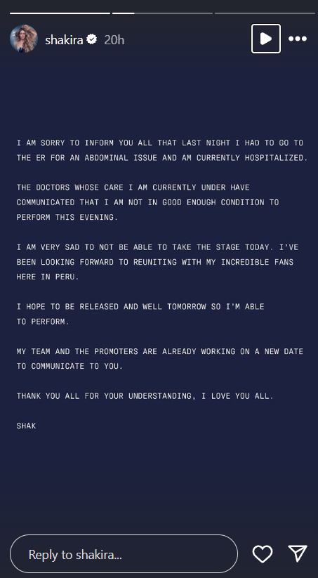 In an Instagram story, Shakira revealed, “I am sorry to inform you all that last night I had to go to the ER for an abdominal issue and am currently hospitalized.”