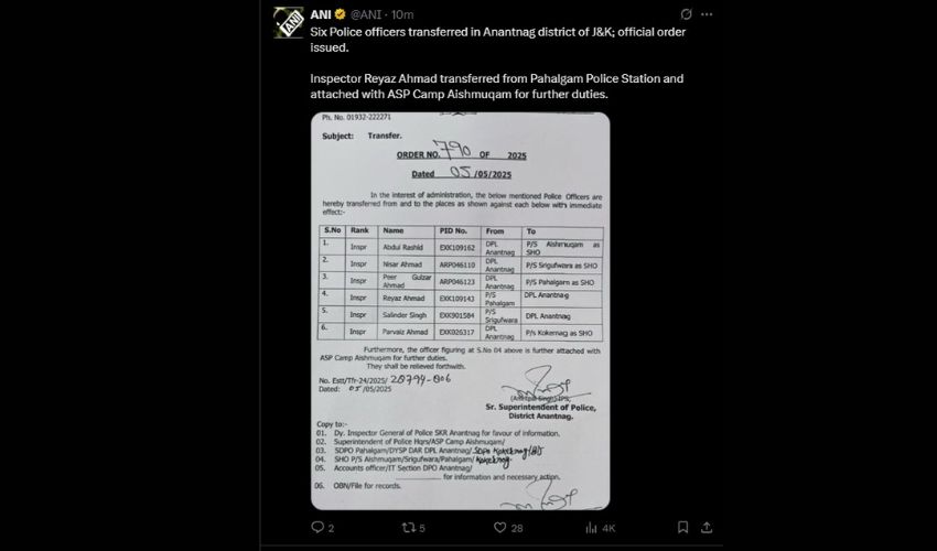 According to an official order, Inspector Reyaz Ahmad has been transferred from Pahalgam Police Station and attached to the ASP Camp in Aishmuqam for further duties.