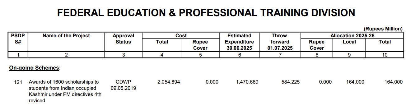 As part of the Public Sector Development Programme (PSDP), Pakistan’s federal government has proposed to allocate 1,600 scholarships for students from Indian-Occupied Jammu and Kashmir.