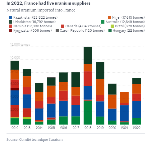 Niger, is one of France's top three uranium suppliers. Over the last 10 years, the 88,200 tonnes of natural uranium imported into France came mainly from three countries: Kazakhstan (27%), Niger (20%), and Uzbekistan (19%).