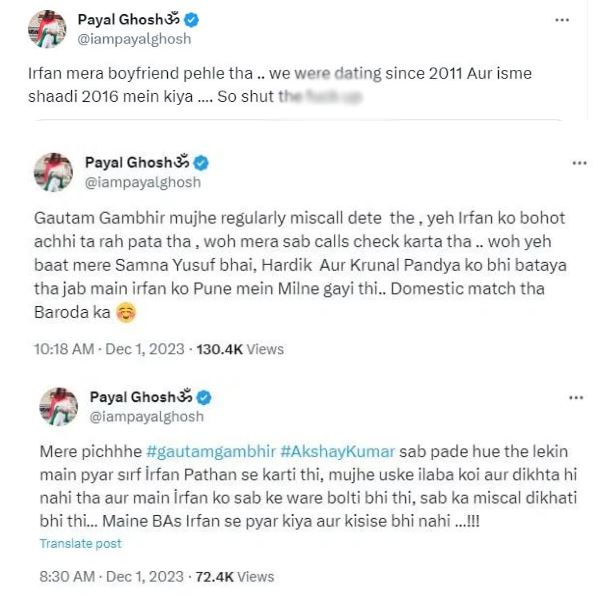 Indian actress Payal Ghosh stirred headlines with a series of now-deleted posts on a social media platform, where she claimed a past romantic involvement with former Indian cricketer Irfan Pathan.