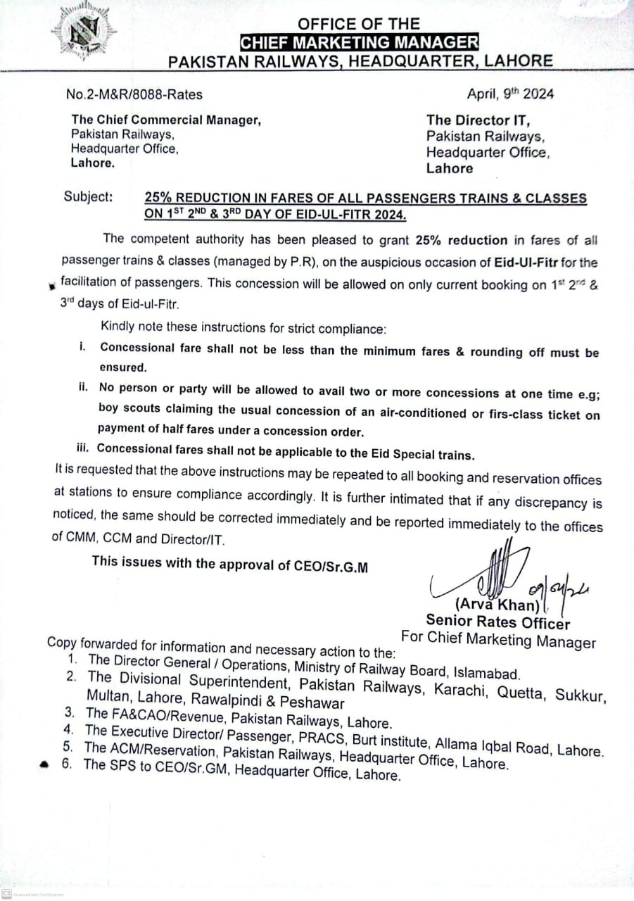 Eid-ul-Fitr: Pakistan Railways announces flat 25 percent discount on all trains