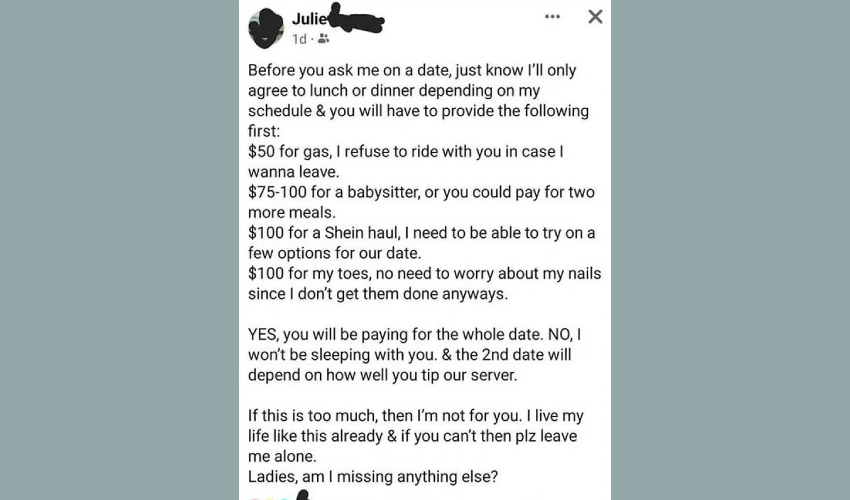 An extreme dater who goes by the name Julie posted a list on Facebook of demands for potential suitors.