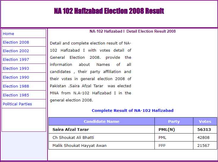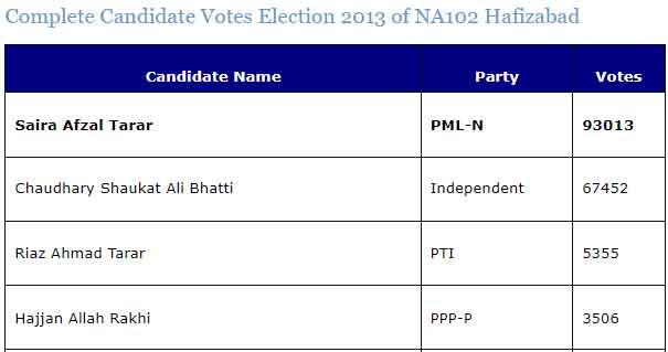 According to the Election Commission of Pakistan, in the 2008 general election, Saira Afzal Tarar secured victory in NA 102 Hafizabad (former constituency) with 56,313 votes, while the Pakistan Muslim League-Q candidate, Chaudhary Shaukat Ali Bhatti, was the runner-up with 42,808 votes.